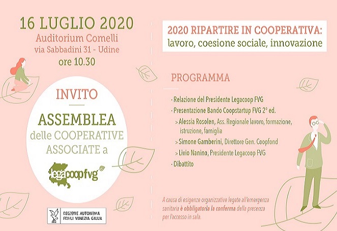 Si svolgerà giovedì 16 luglio prossimo a l’Assemblea delle cooperative associate a Legacoop FVG dal titolo “2020 Ripartire in cooperativa”: lavoro, coesione sociale, innovazione. L’iniziativa si svolgerà alle ore 10,30 presso l’auditorium Comelli in via Sabbadini 31 (Palazzo della Regione Fvg).