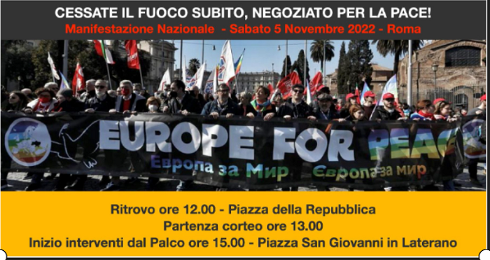 Anche Legacoop Sociali FVG aderisce alla manifestazione di Roma: di seguito tutte le info utili. Il 5 novembre a Roma invitiamo tutti a tornare in piazza per il cessate il fuoco e per l’avvio di una Conferenza di pace. Il dramma dell’Ucraina, il dramma dello stesso popolo russo, oppresso e privo di libertà, il dramma di tanti popoli, non ultimo quello di chi migra, ci impongono di comprendere che la pace e la giustizia non sono richieste assolute o idealità, ma processi reali, cammini da aprire. Consapevoli che la guerra ha un costo che viene pagato dai popoli in conflitto, ma anche da tanti poveri altrove. La pace è una lenta e tenace opera di artigianato che chiede impegno, dialogo e creatività. Ogni popolo ha il diritto di vivere in pace. Chiediamo una Conferenza di Pace che metta in campo il diritto e che permetta di costruire il futuro a partire dagli accordi di Minsk. Abbiamo la responsabilità di ridare parola e creatività alla forza istituzionale ed istitutiva della democrazia, e di nutrirla della partecipazione delle persone. L’Appuntamento è fissato SABATO 5 NOVEMBRE alle ore 12.00 in Piazza della Repubblica a Roma L’inizio corteo è previsto per le ore 13.30 con partenza da Piazza della Repubblica per arrivare a Piazza San Giovanni; Il percorso della manifestazione sarà il seguente: VIA DELLE TERME DI DIOCLEZIANO – VIA AMENDOLA – VIA COVOUR – PIAZZA DELL’ESQUILINO – VIA LIBERIANA – PIAZZA SANTA MARIA MAGGIORE – VIA MERULANA -LARGO BRANCACCIO – VIA MERULANA – VIALE MANZONI – VIA EMANUELE FILIBERTO L’arrivo del corteo è previsto verso le ore 15/15.30 in piazza San Giovanni dove saremo presenti con altri gazebo per distribuire materiale promozionale a coloro che arriveranno direttamente in piazza e dove, eventualmente, sarà possibile riconsegnarlo al termine della manifestazione. Nella piazza sarà allestito un palco dal quale i rappresentanti delle associazioni promotrici della manifestazione terranno un breve discorso per ribadire il senso e il messaggio dell’evento. A questo link ulteriori informazioni e tutti gli enti aderenti http://www.perlapace.it/5-novembre-roma-manifestazione-nazionale/