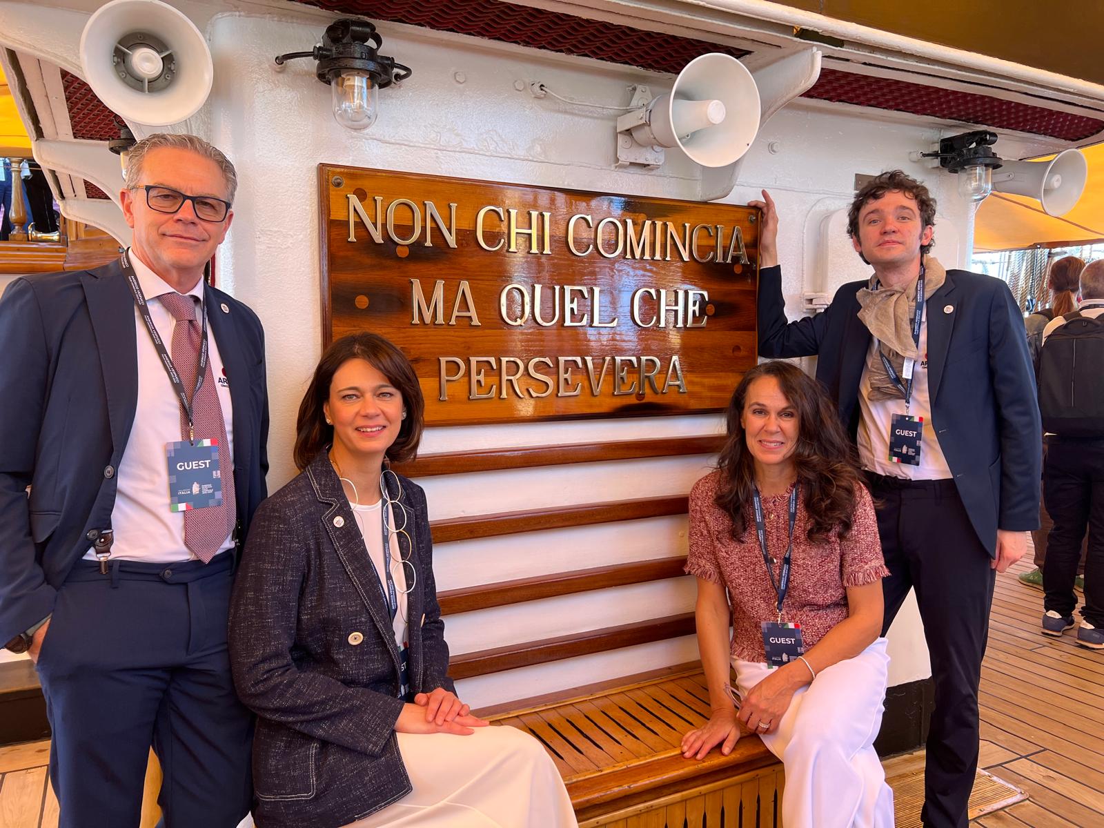 Una giornata indimenticabile a bordo dell’Amerigo Vespucci per Arte e Libro ETS, la cooperativa sociale udinese impegnata nell’inclusione lavorativa di persone con disabilità. La presidente Katia Mignogna, accompagnata da Gabriella Tavasani, founder e board member di Biofarma Group, ha partecipato all’evento promosso dal ministro per le Disabilità Alessandra Locatelli a Jeddah, in occasione del tour mondiale dello storico veliero e nave scuola della Marina Militare, ambasciatore del Made in Italy nel mondo con il Villaggio Italia, spazio innovativo alla scoperta dei tesori del nostro Paese. Nel panel “Italia e Inclusione: la persona al centro”, erano presenti anche la cooperativa “Luna Blu” e l’associazione “Si può fare”. “Un’occasione straordinaria per raccontare il nostro impegno per l’inclusione lavorativa davanti a una platea internazionale“, sottolinea la presidente Mignogna nel ringraziare una volta ancora il ministro “per aver reso tutto questo possibile“. A “testimoniare concretamente quanto siamo riusciti a costruire in questi anni – aggiunge –, sulla Amerigo Vespucci c’è stata l’opportunità di descrivere il laboratorio di Biofarma, situato all’interno della nostra cooperativa, un modello virtuoso che abbiamo voluto condividere con gli ospiti“. Un video ha inoltre descritto tutte le attività e laboratori attivi in Arte e Libro. In foto da sinistra: l’amministratore di Arte e Libro Cristian Vida, la presidente Katia Mignogna, Gabriella Tavasani, founder e board member di Biofarma, Marco Calderone, di Biofarma Guys