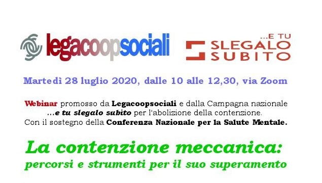 Martedì 28 luglio 2020, dalle 10 alle 12,30, via Zoom Webinar promosso da Legacoopsociali e dalla Campagna nazionale …e tu slegalo subito per l’abolizione della contenzione. Con il sostegno della Conferenza Nazionale per la Salute Mentale. La contenzione meccanica: percorsi e strumenti per il suo superamento INVITO: Webinar La contenzione meccanica: percorsi e strumenti per il suo superamento Time: Jul 28, 2020 10:00 AM – 12:30 AM Join Zoom Meeting https://us02web.zoom.us/j/85107150252?pwd=ZVFwZkR5Szh0NjNzTTZPR2R1alkrQT09 Meeting ID: 851 0715 0252 Password: 731182