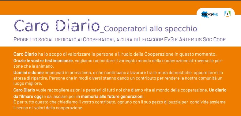 Progetto social “CARO DIARIO – Cooperatori allo specchio”. In un contesto generale dove serpeggia l’incertezza e il timore per il futuro, Legacoop FVG lancia il progetto “Caro Diario”, un format social composto da video realizzati dai cooperatori stessi, dedicato a chi, in periodo Covid19, continua a lavorare, sul campo o da casa, per garantirci i servizi essenziali. Persone che in molti casi lavorano in contesti a rischio e che, come altre categorie giustamente elogiate (medici, infermieri, ecc.), sono meritevoli di attenzione. Per queste ragioni intendiamo dare voce e visibilità ai cooperatori attivi, senza naturalmente dimenticare tutti quelli che, per cause di forza maggiore, sono a casa e si sono dovuti fermare temporaneamente, ma che non di meno fanno parte della nostra “community”. Perché la forza del Movimento cooperativo è da sempre basata sul gruppo, sul gioco di squadra, dove ogni persona rappresenta un tassello fondamentale per rendere le società cooperative più forti e più sane, e dov’è importante il senso di solidarietà e partecipazione. Per la riuscita del progetto sarà fondamentale l’ampia diffusione e l’incoraggiamento a partecipare da parte delle direzioni aziendali. Solo se ci sarà una grande adesione il progetto avrà successo. Obiettivi Mostrare ai nostri stakeholder che la cooperazione è un elemento importante della nostra società e della nostra economia, dando la possibilità a tutte le cooperative iscritte a Legacoop FVG di mostrarsi per quello che sono: imprese responsabili verso i propri lavoratori e impegnate a rendere la comunità un posto migliore. Un piacevole messaggio positivo in questo momento delicato. Gratuità del progetto La partecipazione al progetto non comporta alcun esborso economico da parte dei partecipanti. In questo momento così unico e complesso abbiamo ritenuto che questa iniziativa fosse più che utile al Movimento, ma anche che aggiungere dei costi ai bilanci aziendali rappresenti un disincentivo alla partecipazione, col rischio di escludere realtà e situazioni sicuramente interessanti per tutti. Per questo Legacoop FVG si avvale della collaborazione dei cooperatori di Artemius, che ringrazia per il loro supporto tecnico e progettuale, fornito a titolo gratuito per senso di appartenenza al mondo cooperativo. Caro Diario kit video2 (1)