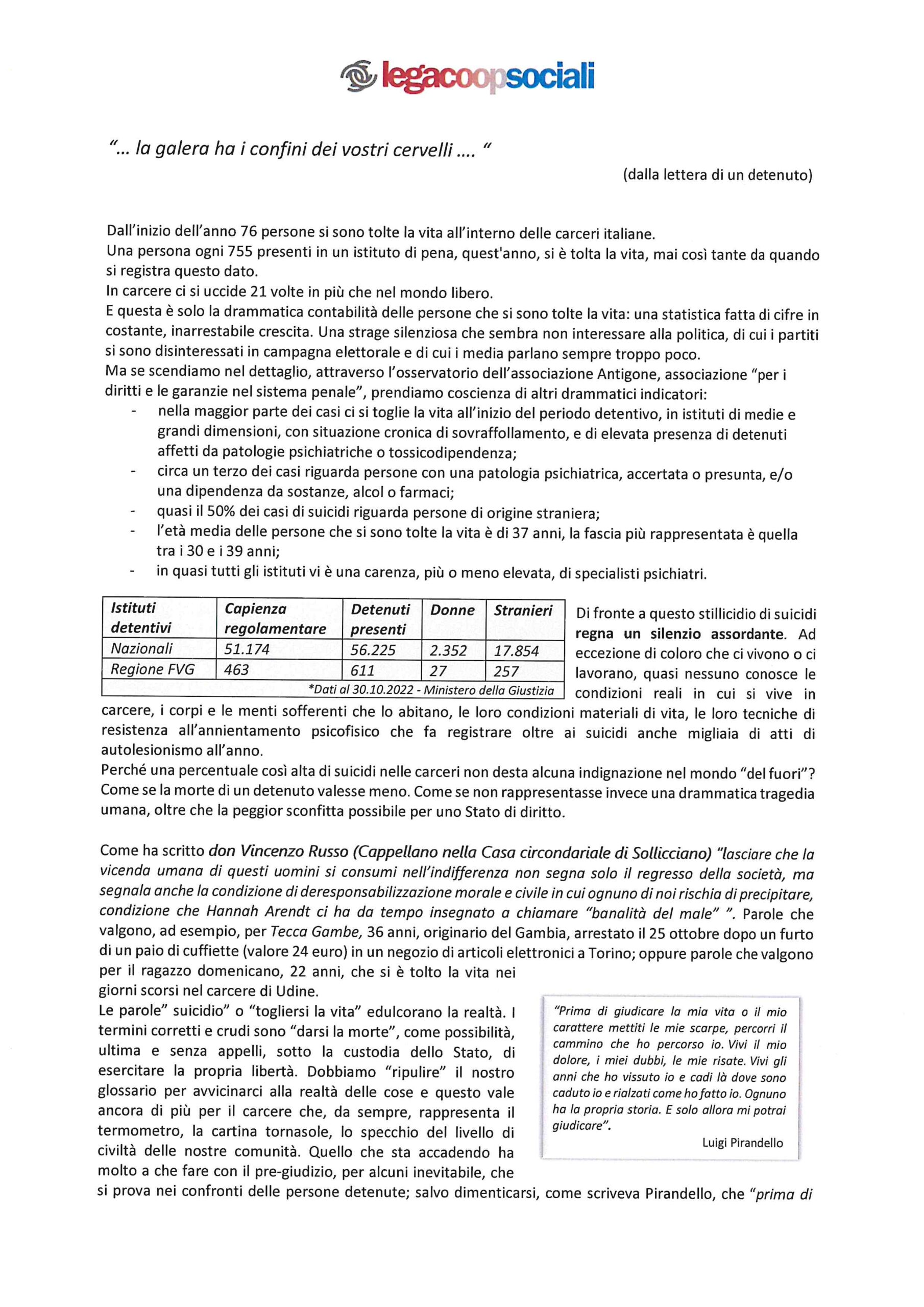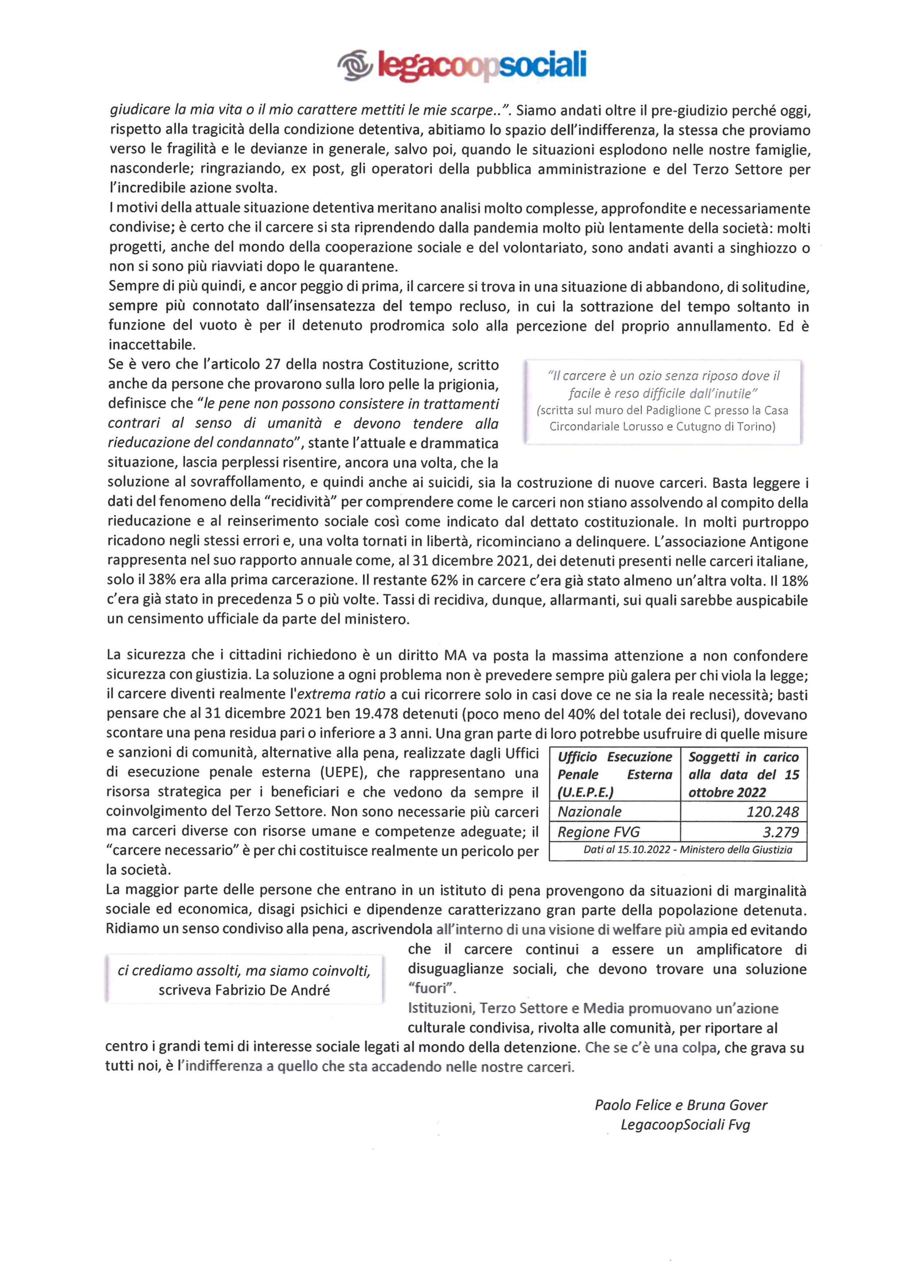 Commento di LegacoopSocialiFVG rispetto alla drammatica emergenza delle carceri italiane