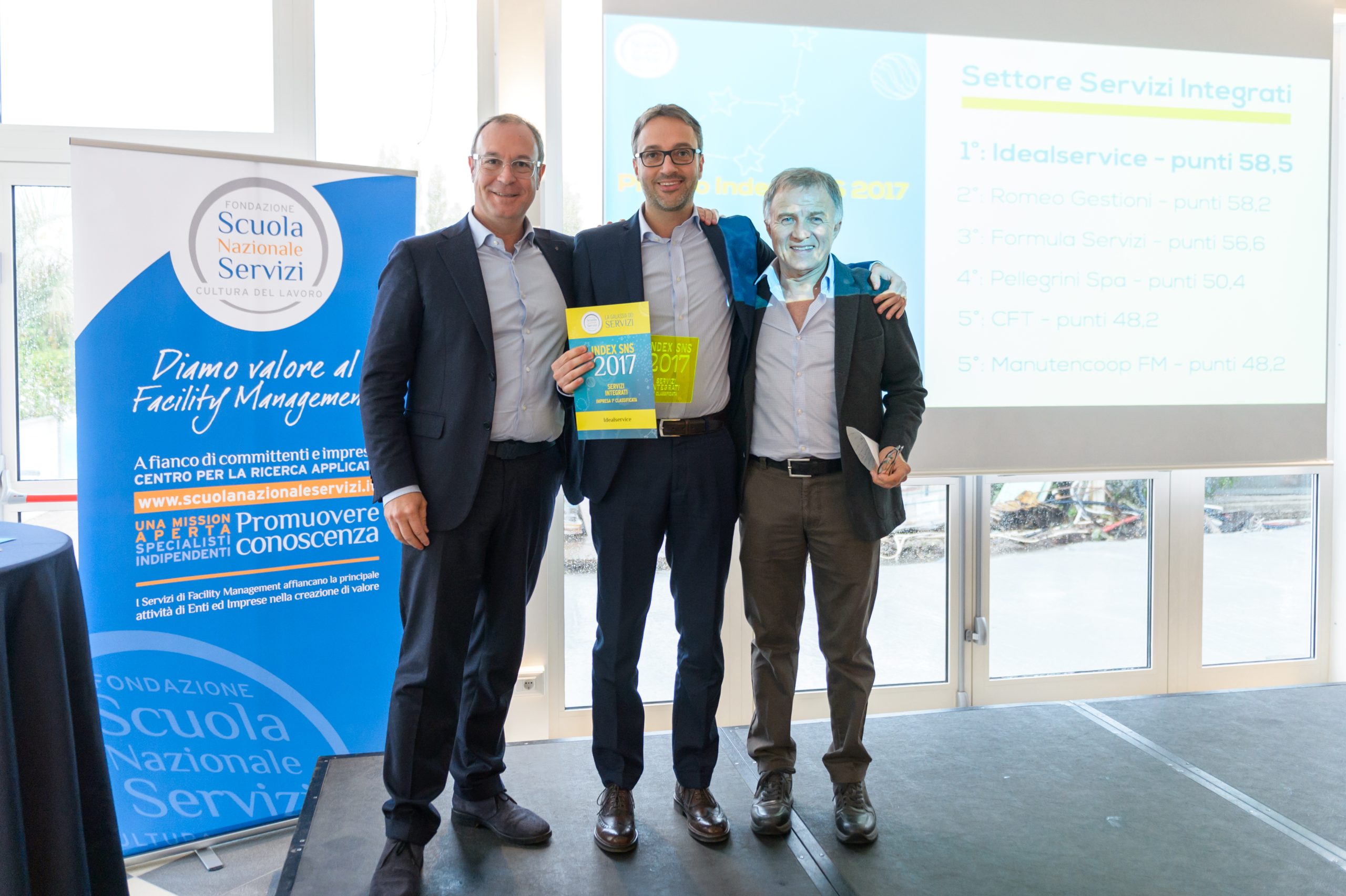 I premi Index SNS 2017 per ogni settore sono invece stati assegnati a: Econord (Varese) – Servizi Ambientali; Coopculture (Venezia) – Servizi Culturali; Saccir (Roma) – Energia e manutenzione; Servizi Italia (Parma) – Servizi di Lavanolo; Coop. San Martino (Piacenza) – Servizi di Logistica; Coop. Soc. Anteo (Biella) – Servizi alla Persona; Copma (Ferrara) e Copura (Ravenna) – Pulizie Professionali; Camst (Bologna) – Ristorazione Collettiva; Civis (Milano) – Servizi di Vigilanza; Idealservice (Udine) – Servizi Integrati.