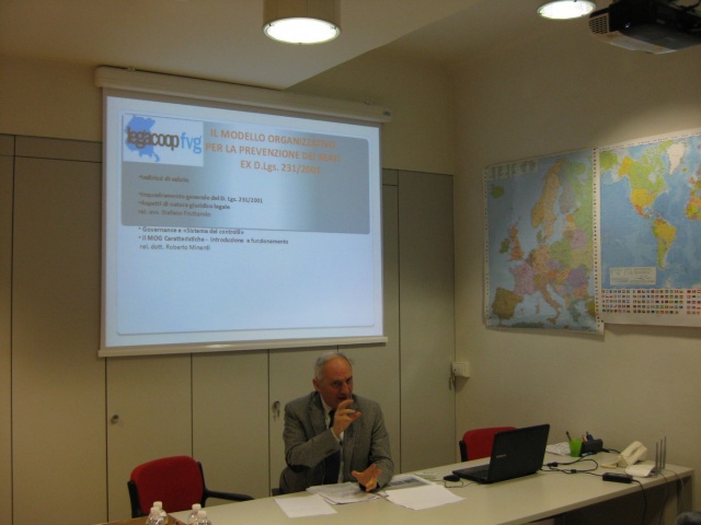 I relatori intervenuti ad affrontare gli argomenti sono stati l’avvocato Stefano Fruttarolo, conoscitore della cooperazione e specialista in materia di diritto del lavoro, diritto societario e D.Lgs. 231/2001 e Roberto Minardi – dottore commercialista, revisore, componente di diversi Organismi di vigilanza, presidente della commissione di studio sulla 231/2001 dell’Ordine dei Dottori Commercialisti della provincia di Udine.