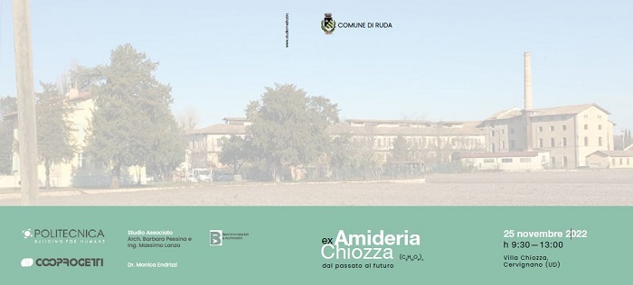 Il sindaco di Ruda e i partners del progetto di riqualificazione e valorizzazione dell’Ex Amideria Chiozza di Ruda (UD) – Politecnica Soc.Coop. di Modena, Cooprogetti scrl di Pordenone, Studio Pessina-Lanza di Palmanova, la restauratrice Monica Endrizzi di Casale sul Sile (TV) e BIA (Beni Immateriali e Archivistici) – hanno il piacere di presentare il lavoro in corso ed i possibili ed importanti sviluppi dello stesso nel Convegno “L’Amideria Chiozza dal passato al futuro”. L’appuntamento è per venerdì 25 novembre dalle 9.30 alle 13 a Villa Chiozza di Cervignano del Friuli.