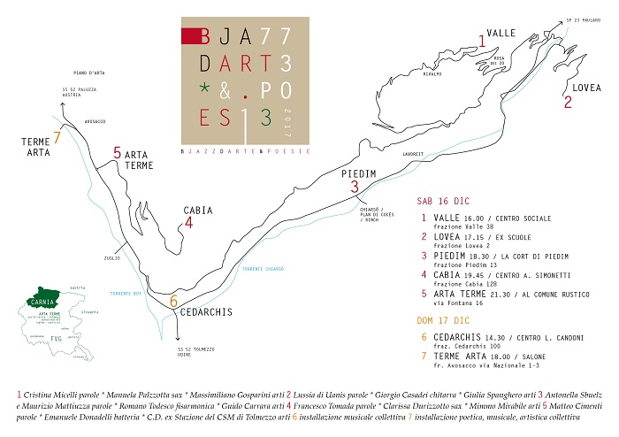 II edizione L’Associazione Culturale Euritmica e MusiCarnia 2017 present BJazzDarte&Poesie MusiCarnia incontra l’arte e la poesia un collettivo di sperimentazione culturale ad Arta Terme e nelle sue frazioni INGRESSO LIBERO Continua la stagione 2017 di MusiCarnia con un progetto innovativo realizzato con il sostegno della Regione Autonoma Friuli Venezia Giulia e del Comune di Arta Terme BjazzDarte&Poesie: il soggiorno dei Poeti e degli Artisti \ Progetto Casamia sabato 16 dicembre dalle ore 16 e domenica 17 dicembre dalle ore 14:30 programma completo degli eventi www.euritmica.it MusiCarnia incontra l’arte e la poesia: sabato 16 (dalle 16:00) e domenica 17 Dicembre 2017 (dalle 14:30) ad Arta Terme prenderà forma un esperimento culturale che farà incontrare un collettivo di poeti, musicisti e artisti attraverso una serie di azioni condivise. Il titolo della manifestazione, BJazzDarte&Poesie, riassume in un gioco di parole il senso stesso dell’iniziativa e mette in relazione tre progetti, sostenuti dalla Regione Autonoma Friuli Venezia Giulia, quali Musicarnia, Il soggiorno dei Poeti e degli Artisti e Casamia. L’incontro toccherà alcune frazioni di Arta Terme in una sorta di progetto di prossimità culturale, che vedrà coinvolti i poeti Cristina Micelli, Antonella Sbuelz, Lussia di Uanis, Matteo Cimenti, Maurizio Mattiuzza e Francesco Tomada, accompagnati dai musicisti Clarissa Durizzotto (sax e clarinetto), Manuela Plazzotta (sax), Giorgio Casadei (chitarra), Emanuel Donadelli (batteria) e Romano Todesco (fisarmonica). Gli artisti Giulia Spanghero, Guido Carrara, Massimiliano Gosparini e Mimmo Mirabile, nonché i lavori messi in cantiere dal Centro Diurno “ex Stazione” del CSM di Tolmezzo, aggiungeranno una terza dimensione a questo spettacolo estemporaneo. La formula prevede 5 piccoli gruppi che solo nel momento finale di domenica alle 18.00 troverà una sintesi collettiva nel salone delle Terme. Contestualmente, i musicisti, grazie allo spazio messo a disposizione dal Progetto Casamia presso l’Albergo Diffuso di Comeglians, elaboreranno un percorso che raccoglierà le suggestioni della musica tradizionale e le composizioni di Giorgio Casadei, eclettico direttore di svariati ensemble. I partner coinvolti sono il Comune di Arta Terme, i gruppi e le associazioni frazionali di Arta, le associazioni culturali Euritmica, Lander e Cocula, il progetto Casamia e la Cooperativa Itaca, quest’ultima presente con azioni di coinvolgimento di esperienze presenti sul territorio. Il programma completo degli appuntamenti è disponibile su www.euritmica.it e sul sito del Comune di Arta Terme. La rassegna MusiCarnia prosegue con due concerti: giovedì 28 dicembre, alle 21:00, il nuovissimo Palazzetto di Ravascletto ospiterà il concerto dei 4B Acoustic Trio mentre mercoledì 10 gennaio, alle 18 al Teatro Candoni di Tolmezzo, sarà la volta della Udin&Jazz Big Band, orchestra nata 2016 da un’idea di Emanuele Filippi e Mirko Cisilino, in collaborazione con Euritmica e il suo direttore artistico Giancarlo Velliscig, che riunisce molti tra i migliori giovani professionisti del jazz del triveneto. Tutti gli eventi sono ad ingresso libero. Info: www.euritmica.it tel: 04342 1744261 – mail stampa@euritmica.it