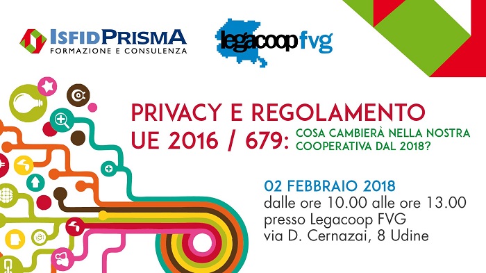 Il 2 febbraio 2018 dalle ore 10.00 si terrà presso la sede della Legacoop FVG in V.Cernazai, 8 – Udine un seminario sulle novità previste dall’applicazione del Regolamento UE 679 del 2016 in merito al trattamento dei dati all’interno delle cooperative. Modalità adesione: compilare la scheda in allegato e trasmetterla in: segreteria@fvg.legacoop.it