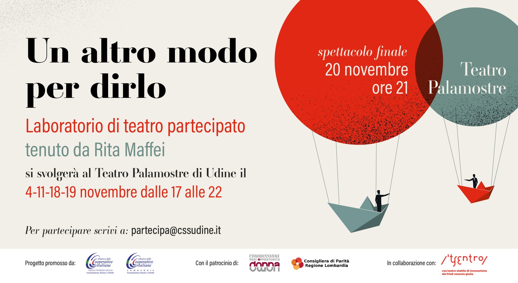 Un altro modo per dirlo laboratorio di teatro partecipato tenuto da Rita Maffei. Questo il prossimo evento che si propone di riflettere sul tema del contrasto alle molestie sul posto di lavoro partendo dall’utilizzo consapevole del linguaggio. Teatro Palamostre di Udine: 4-11-18-19 dalle 17 alle 22. Spettacolo finale: 20 novembre ore 21. Un altro modo per dirlo, è un laboratorio tenuto da Rita Maffei che attraverso gli strumenti del teatro partecipato si propone di riflettere sul tema del contrasto alle molestie sul posto di lavoro partendo dall’utilizzo consapevole del linguaggio. Il linguaggio è lo strumento tutto e solo umano attraverso il quale entriamo in comunicazione con il mondo, a volte costruendo ponti e a volte erigendo barriere. Per la centralità che riveste nella vita delle persone e l’incidenza nella stessa evoluzione della specie umana, il linguaggio è stato – sin dalle origini – oggetto di riflessione e analisi filosofica. La scelta delle parole, gli effetti che queste hanno nel nostro interlocutore diventano fondamentali per costruire relazioni nutrienti e autentiche. Prima di esprimerci, dovremmo allora essere in grado di domandarci, come ricorda un vecchio detto sufi, se quello che andiamo a dire corrisponde a verità, se è davvero utile in quel momento, e se è gentile. Gli incontri di laboratorio previsti si svolgeranno nella sala Carmelo Bene del Teatro Palamostre di Udine il 4-11-18-19-20 novembre dalle 17 alle 22 e lo spettacolo/incontro finale è previsto per il 20 novembre alle ore 21 al Teatro Palamostre sala Pasolini. Progetto promosso da: ACI – Commissione Donne e Parità FVG, ACI – Commissione Donne e Parità Lombardia, Patrocinato: Commissione Regionale Pari Opportunità FVG, Consigliera di Parità Regione Lombardia, in collaborazione con CSS Teatro stabile di innovazione del FVG Per partecipare scrivere a: partecipa@cssudine.it