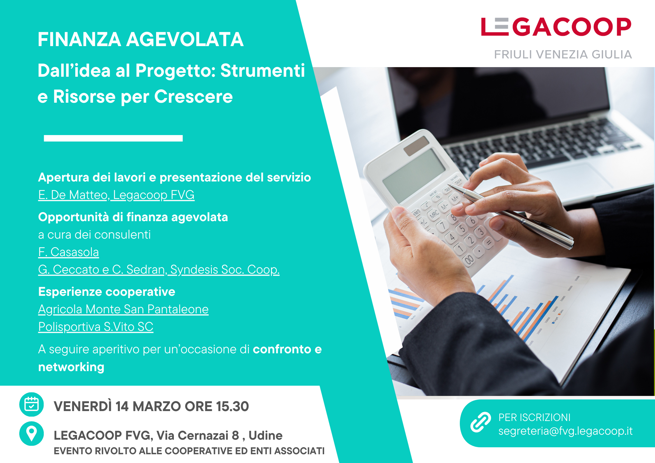 Le cooperative hanno a disposizione numerose opportunità di finanza agevolata che possono rappresentare un’importante leva di crescita e sviluppo. Per aiutare le imprese cooperative a orientarsi tra contributi, finanziamenti a tasso agevolato e bandi dedicati, Legacoop Fvg organizza un incontro di approfondimento venerdì 14 marzo, alle ore 15.30, presso la propria sede in Via Cernazai 8 a Udine. L’iniziativa mira a fornire una panoramica sulle agevolazioni disponibili, evidenziando i benefici concreti ottenibili. Una corretta conoscenza di questi strumenti permette infatti di pianificare al meglio gli investimenti, migliorare la liquidità aziendale, ridurre il rischio finanziario e aumentare la competitività sul mercato. Durante l’evento, i consulenti esperti Fabrizio Casasola, Gianluca Ceccato e Cristian Sedran (questi ultimi due di Syndesis Soc. Coop.) illustreranno il funzionamento della finanza agevolata, con particolare attenzione ai bandi attivi e in uscita nel 2025 nei settori dell’artigianato, della cultura, del turismo e altri ambiti strategici per il mondo cooperativo. Oltre alla parte teorica, ci sarà spazio per esperienze dirette: interverranno infatti Agricola Monte San Pantaleone e Polisportiva S. Vito SC, due cooperative che, grazie a contributi ottenuti, stanno portando avanti progetti di sviluppo strategico. Al termine dell’incontro, sarà possibile confrontarsi direttamente con i consulenti in un momento di networking informale, utile per approfondire le tematiche trattate e discutere esigenze specifiche. L’evento è aperto a tutte le cooperative e agli enti associati interessati a conoscere le opportunità offerte dalla finanza agevolata. Per informazioni e iscrizioni: scrivere a segreteria@fvg.legacoop.it.