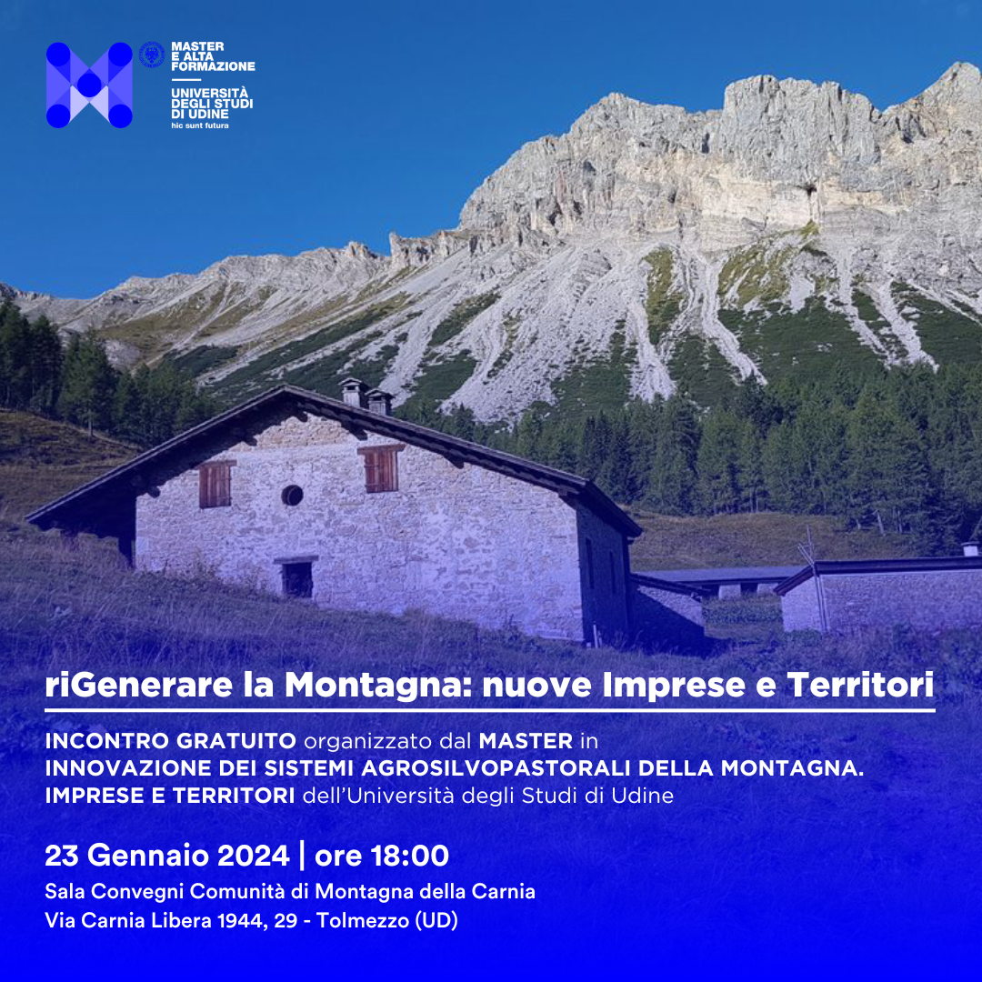 Creare di una nuova imprenditorialità in montagna, nello specifico di imprese agrosilvopastorali. Ma anche partecipazione e rigenerazione delle comunità locali e valorizzazione dei territori montani. Sono gli obiettivi formativi della prima edizione del Master di I livello in Innovazione dei sistemi agrosilvopastorali della montagna. Per comprendere e illustrare contenuti e finalità del corso, sostenuto anche da Legacoop Fvg, è in programma, martedì 23 gennaio alle 18 Tolmezzo, un incontro informativo. La partecipazione all’appuntamento, che si terrà nella sala convegni della Comunità di montagna della Carnia (via Carnia Libera 1944, 29) è gratuita e aperta a tutti e tutte.